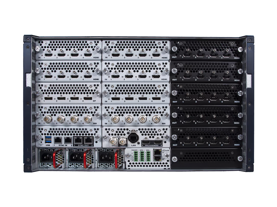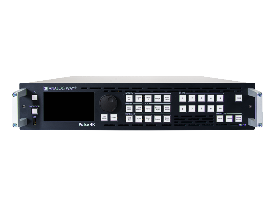 O Pulse 4K é um mixer de vídeo multi-layers 4K60 e switcher de apresentações seamless, equipado com 10 entradas, 2 saídas PGM e 1 Multiviewer dedicado. Suporta sinais HDMI 2.0, DisplayPort 1.2 e 12G-SDI, com compatibilidade HDR, conversão de cores via 3D LUT e processamento de áudio integrado, incluindo Dante (opcional).