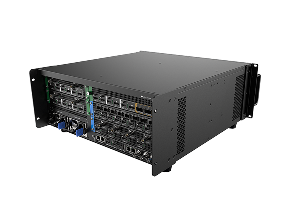 Suporta até 12 entradas 4K simultâneas (HDMI 2.0, DP 1.2 e 12G-SDI) e múltiplas saídas, incluindo 8 HDMI 2.0, 4 flex outputs HDMI 2.0, matriz 12G-SDI e 2 Multiviewer dedicados.